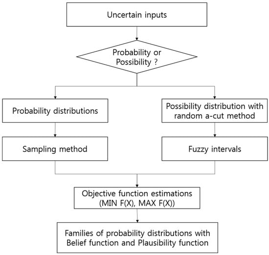 Figure 2 shows a fuzzy MCS process considering aleatory and epistemic uncertainty. The selected unknown inputs in the model need to be divided into probability distributions that have an aleatory nature or possibility distributions that have an epistemic nature. Probability distributions are propagated using the sampling methods—e.g., Latin hypercube sampling (LHS)—while possibility distributions are represented as minimum–maximum intervals using the random fuzzy