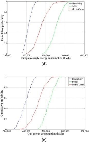 Figure 5 show the uncertainty results of the fuzzy MCS compared with those of the MCS. In the case of the fuzzy MCS, the uncertainty results were represented as a family of probability distributions with a range between plausibility and belief distribution. On the other hand, the results of the MCS are located between the plausibility and belief distribution.