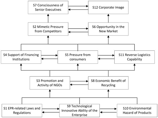 The hierarchical relationships of the driving factors of EPR were obtained based on the steps presented. ISM can be represented by Figure 2 by following the level partitions of driving factors (Table 5) and the final reachability matrix (Table 4). The existence and direction of the arrow between Elements i and j are determined by the relationship between them (Step 6). The ISM graph is shown in Figure 2.