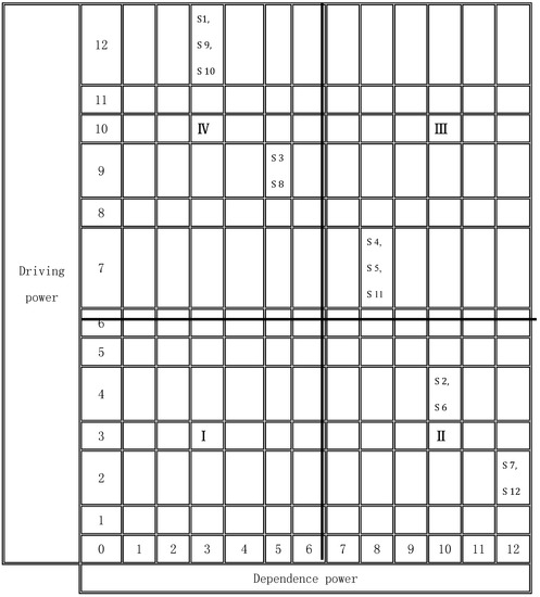 (2) Dependent drivers always have weak driving power and strong dependence power. Elements S2, S6, S7, and S12 are strongly dependent on other factors. Dependent factors always appear on the top of the ISM digraph. These drivers are presented in Quadrant II.