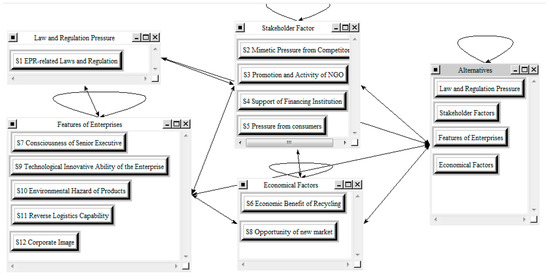 In the previous sections, the relationships and hierarchy of the driving factors were analysed through ISM. However, the sequence of importance of these driving factors cannot be presented by ISM. The current section ranks the driving factors of EPR through ANP. The 12 driving factors were divided into four clusters in terms of their types. The four clusters are law and regulation pressure, stakeholder factors, features of enterprises, and economic factors. The proposed ANP hierarchical structure is shown in Figure 4.
