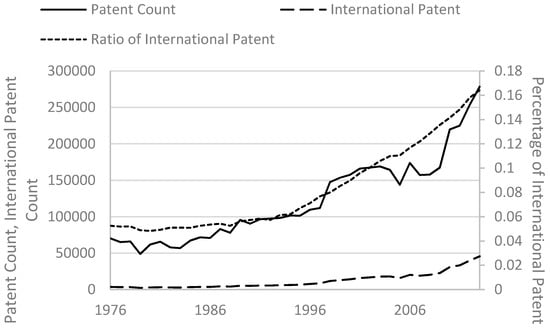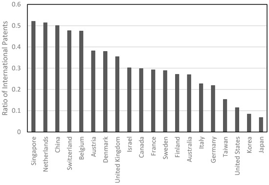 Hence, multiple counting is used for cross-countries comparison. As shown in Figure 3 which compares the ratios of international patents for the Top 20 countries in terms of the total patents granted by USPTO. It can be observed that Nos. 1–3 are Singapore, Netherlands and China, with more than 50% international patents. Most countries with more than 30% international patents are small countries but China is an exception. Small countries rely more on trade and likely to adopt liberal trading policies, therefore small countries perform better than large countries in terms of trade facilitation [93] and therefore it can be expected that small countries are more international than large countries. However, China is a very large country but still ranked No. 3 in terms of the ratio of international patents. The spectacular rate of Chinese economic growth has been triggered by the expansion in foreign trade and foreign direct investment [94]. Therefore, unprecedented internationalization is observed in China.