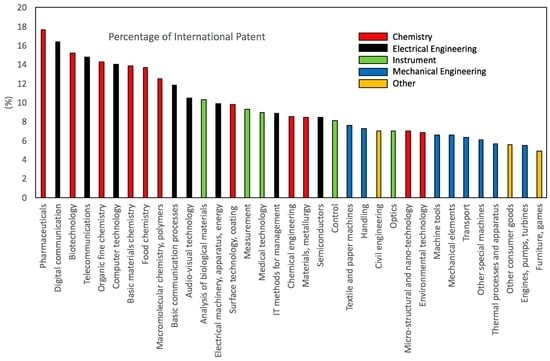 Considering different industries might have different degree of internationalization. This study classified international patents into five main industries, Chemistry, Electrical Engineering, Instrument, Mechanical Engineering, and Other fields, and the five main industries are further classified into 35 sub-industries based on the IPC to industries concordance proposed in prior study [86], to facilitate cross-industries comparison on the level of internationalization. The results are provided in Figure 2. The Top 10 industries with the largest portions of international patents indicate the highly internationalized industries are all related to Information and Communications Technology (ICT) and biochemistry. Since digital information and the Internet are borderless, the very high internationalization in ICT can be expected. Pharmaceutical industry, ranked as No. 1, is a capital-driven and knowledge driven industry where firms tend to locate foreign resources and knowledge to synergize home and foreign country advantages for enhancing the quality of R&D output. Several of the Top 10 industries directly related to pharmaceutical industry are biotechnology (No. 2), organic fine chemistry (No. 5) and food chemistry (No. 8). It can be observed in general that Chemistry and Electrical Engineering industries are more internationalized, Mechanical Engineering and Other fields are less internationalized, and Instrument industry is somewhere in the middle.