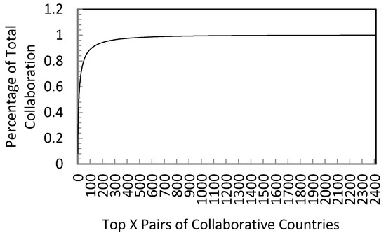 To estimate how the distribution is skewed, the top pairs of collaborative countries and their collaboration times are analyzed. The maximum number of collaborations is the pair between US and Germany (40,759 collaborations), the second largest pair is between Japan and US (40,424), the third pair is between UK and US (40,250). The Top 10 pairs account for 250,816 collaborations (50.97%). Countries involved in the Top 10 pairs of collaborations are Germany, US, Japan, United Kingdom, Canada, Netherlands, France, Switzerland, Israel, and India. The Top 20 pairs account for 319,513 collaborations (64.93%), The Top 50 pairs of countries account for 395,806 collaborations (80.43% of the total collaboration). However, there are 1041 pairs of collaborative countries that only collaborated one or two times. The overall statistics is provided in Figure 5.