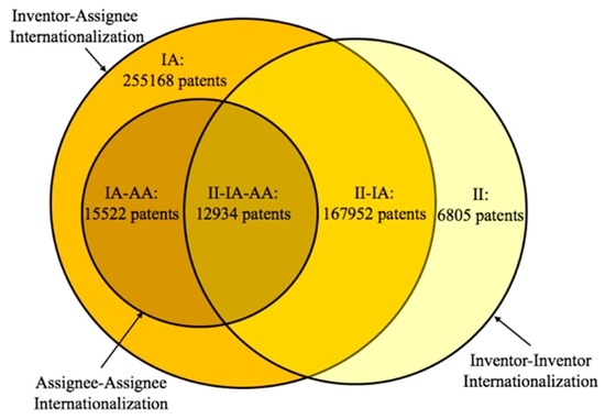 - II-IA-AA a patent meets three criteria, i.e., Inventor–Inventor, Inventor–Assignee and Assignee–Assignee internationalization (II-IA-AA = InvInv ∩ InvAss ∩ AssAss).
