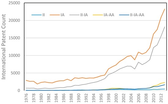 Table 1 presents illustrative example of patents concerned with the five types of international patents. This new classification system provides a better resolution for investigating internationalization of R&D because this system classifies all international patents into five types as shown in Figure 6. The patent counts for each type of international patents are: II: 6805 patents; IA: 255,168 patents; II-IA: 167,952 patents; IA-AA: 15,522 patents; and II-IA-AA: 12,934 patents. The longitudinal results of patent counts are provided in Figure 7. It can be observed that all five types of international patents have grown since the 1990s at different rates. The patent counts of IA and II-IA are much larger than those of the three other types of patents.
