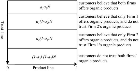 In addition to the product line, customers are also uniformly distributed along an organic trust line, where customers have different beliefs regarding the firms’ organic credence system. The product line and the trust line constitute a rectangular space, which represents the whole market where the customers are uniformly distributed. When both firms offer organic food products, given two firms’ organic credence system investment, the trust ratio and are determined. Along the trust line, the probability that a customer trusts both firms’ organic food products is , the probability that a customer trusts Firm1’s organic food products but does not trust Firm 2’s organic food products is , the probability that a customer trusts in Firm2’s organic food products but does not trust Firm 1’s organic food products is , and the probability that a customer does not trust both firms’ organic food products is . Thus, we can see that the whole market can be divided into four parts: customers trusting both Firms’ organic food products, customers only believing that firm 1’s food products are organic, customers only believing that Firm 2’s food products are organic, and the rest of the customers trust neither of the two firms. The market structure is illustrated in Figure 1.