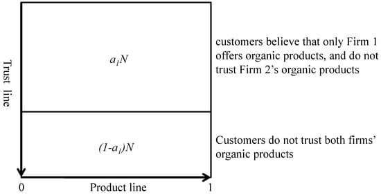 In the model of our paper, two firms are competing on a product line, where customers are located. The distance from customers position to the ends of the product line represents the preference for a firm. This model is based on the Hotelling’s model, in which two firms compete in location and price within a linear city. The classic model has been widely applied in much work [,,]. Gabszewicz and Thisse [] study the product differentiation problem. Syam and Kumar [], and Xia and Rajagopalan [] analyze competition with customized and standard goods. In the above models, firms’ variety or customization decisions can directly change customers’ utility. Similar to this area of the literature, in our model, organic food products bring additional benefits to customers. The major difference is that we further introduce an organic trust attribute to customers. Firms’ investments on credence influences customers’ trust, and the customers’ buying behavior is based on their trust. To the best of our knowledge, the model in this paper first builds a connection from credence investment, to the consumer trust, then to consumer buying behavior, and finally to the firms’ demand function.