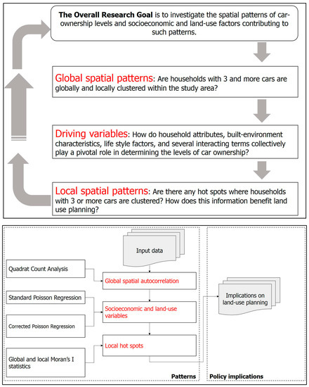 Figure 2 exhibits an overall outline for this study. A quadrat count analysis was first conducted to examine whether or not the spatial pattern of households with high levels of car ownership (three or more cars) is non-random. Second, the Poisson regression accounting for spatial autocorrelation was used to recognize the factors influencing vehicle ownership. Poisson regression has been proved to be powerful in modeling count data [50]. Finally, the Global Moran’s I statistics were used to validate the results of the quadrat count analysis regarding the point patterns of automobile ownership. We also employed the local version of the Moran’s I to identify hot spots or cool zones. The model specifications are introduced in the next few sub sections.
