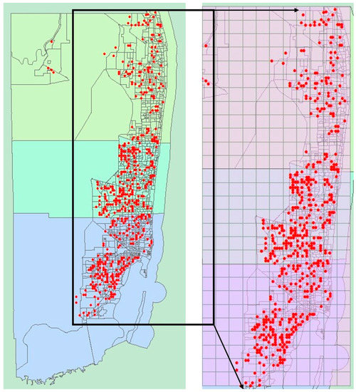 Three counties in southern Florida, US: Broward, Palm-Beach, and Miami-Dade, were identified as study areas in the empirical analysis because these counties are home to Miami, Fort Lauderdale, and other coastal megacities with enormous populations and exceptionally high levels of automobile reliance (Figure 1). Three data sources were used in this research. First, the National Household Travel Survey (NHTS) created by Federal Highway Administration represents a foundation of our data structures. There exist multiple versions of the NHTS [47]. This study opted to use the 2009 one, which is the most recent version with comprehensive information. The survey was conducted from March 2008 through May 2009 in the majority of the states in the USA. The NHTS provides such information as the travel patterns and socio-demographics of responding households. Specifically, NHTS’s focus groups are the civilian and non-institutionalized populations, which denote households in this article. Second, the data concerning built environments stemmed from the parcel data downloaded from the Florida Department of Revenue [48] and were processed by the Institute of Transportation Engineers at the University of Florida. This data set primarily offered knowledge regarding land use types and transit accessibility. Third, the Tiger 2010 Census Tract Files collected from the Geospatial Data Gateway [49] were used to ameliorate the presentation quality. After data preprocessing and the mapping of the numerical data onto census tract maps, a sample comprising 3980 households was identified. The following section will discuss the main procedures for data processing and the model specifications in detail.