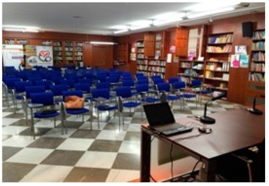 It is a large room with the capacity to hold about 75 people, usually used for conferences and other events (Figure 2). Besides this use, some therapy sessions with the women participating in this study took place in this room. Although it has some windows, they look onto an extremely narrow street and they are always curtained. Hence, there is no natural light and any activity needs electrical lighting, which is provided by means of 15 luminaries, each with two 18W “LED tubes” having a correlated color temperature Tcc = 6000 K. The installed power in the Auditorium is 540 W.