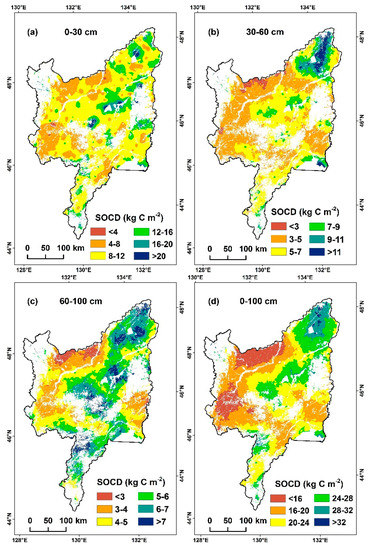 | Area (km2) | SOCD (kg·C·m−2) | SOC Storage (Pg·C) | Area (km2) | SOCD (kg·C·m−2) | SOC Storage (Pg·C) | ||