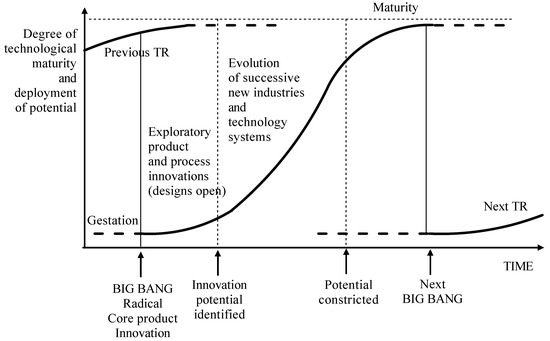 In the present paper, we combine the technological paradigm with biomass, and propose a new concept for the biomass energy technological paradigm (BETP), which is one of the low-carbon energy technological paradigms. As mentioned above, the evolution of the technological paradigm has distinct characteristics in each stage, which can also be verified by the foci analysis using the CiteSpace visualization tool. The changes in each stage examine the technological paradigm, which results in its evolution divided into three stages, which are shown in Figure 1, the technological revolution life trajectory.