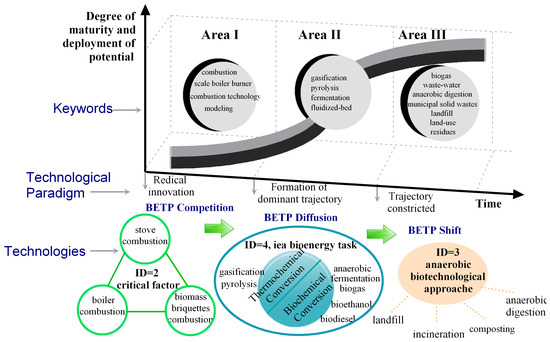 From above analysis, combining the technological paradigm with biomass energy, a new concept of the biomass energy technological paradigm (BETP) is proposed. Derived from the well-known S-curve [28], this evolution trace is shown in the above part in Figure 5. The competition stage represents the early technology development of the technological paradigm, which involves various trajectories and barriers. In the diffusion phase, a dominant path prevails in the potential market. A technological shift occurs when technology saturates and there are natural limits. The three stages in the BETP include BETP competition, BETP diffusion, and BETP shift, all of which are discussed in the following.
