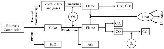 From the foci trend analysis and the combination of paradigmatic evolution theory, direct combustion was the main application in the BETP competition phase. Direct combustion of biomass is a traditional method for the earliest use of biomass energy [44], and is the process of using biomass as a fuel to produce energy without the use of chemical conversion [45]. The biomass fuel combustion process involves both a strong chemical reaction process and a heat and mass transfer process between the fuel and the air. In addition to the fuel, this type of combustion requires an adequate heat and air supply. As shown in Figure 6, the biomass combustion process can be broadly divided into preheating, drying (evaporation), an analysis of volatility, and a coke (fixed carbon) combustion process [46]. BETP competition was mainly divided into three main evolutionary paths: stove combustion, boiler combustion, and biomass briquette combustion [47].