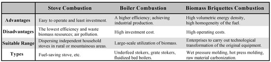 A new type of direct fuel combustion has appeared, called biomass briquettes combustion. Due to its irregular shape and size, high moisture content, and low bulk density, biomass is quite difficult to handle, transport, store, and utilize in its original form. One solution to the above problems is to increase the density of biomass materials into pellets, briquettes, or cubes [55]. Biomass briquettes combustion uses this high-density solid fuel in traditional coal-fired equipment to improve thermal efficiency. After solidification, the raw material has high volumetric energy density and high homogeneity of the fuel [56], and the pollution emissions are much lower than coal, making this technology a highly-efficient clean and renewable energy [57]. There are a variety of processes used for biomass compression molding. Depending on the technical characteristics, biomass compression molding can be divided into three basic types: wet pressure molding, hot press molding, and raw material carbonization [58]. These kinds of combustion methods use traditional coal-fired burning equipment after curing, which can reduce the biomass raw material volume needed, greatly increase the fuel energy density, and improve the utilization efficiency [59].