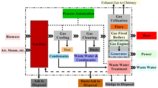 Biomass gasification technology has two types of gasifiers: fixed bed gasifiers and fluidized bed gasifiers [67]. The fixed beds have a wide temperature distribution. This includes possibilities for hot spots with ash fusion, low specific capacity, long periods for heat-up and a limited scale-up potential [67]. However, fixed bed suffers from the disadvantage that gas flow must be stopped for cleaning [68,69]. Fluidized beds have good heat and material transfer between the gas and solid phases with the best temperature distribution, high specific capacity, and fast heat-up. Disadvantages of fluidized beds are high dust content in the gas phase and the conflict between high reaction temperatures with good conversion efficiency and low melting points of ash components [67]. Additionally, gasification is the key technology of biomass-based power generation. However, there are a number of key technological challenges that retard the commercial application of biomass gasification for power generation [70].