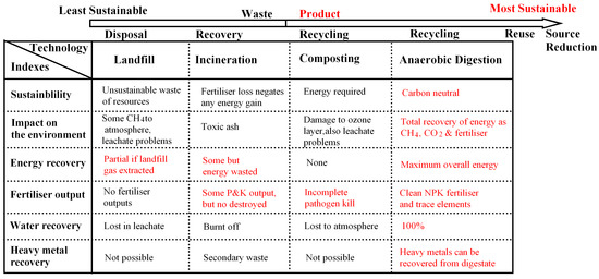 There are a variety of treatment methods for biodegradable MSW. We can bury it, which means landfilling; burn it, which means incineration; and bio-digest it, which means either composting or anaerobic digestion. Others include gasification, pyrolysis, compression molding, and pouring into the sea, all of which are being promoted and used all over the world [118]. The EPA developed the non-hazardous materials and waste management hierarchy which ranks the various management strategies from most to least environmentally preferred [119,120]. The hierarchy places emphasis on reducing, reusing, and recycling as key to sustainable materials management. Combining this hierarchy framework with MSW treatment technologies, like landfill, incineration, composting, and anaerobic digestion, the comparison of the above technologies from some aspects are shown in Figure 9, and red font in figure indicates positive impact. Additionally, a schematic representation of the above four processes is shown in Figure 10, which are inputs and outputs of landfill, incineration, composting, and anaerobic digestion. A detailed description of each process is represented as follows.