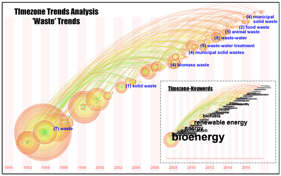 The evolution of the technology paradigm has significant stage characteristics along with the promotion of market demand and industrial technology competition [43]. According to the final effect of the change of each stage, the evolution of the technological paradigm can be divided into three stages: competition, diffusion, and shift. By combining the paradigm with clusters, the emergence of these three clusters is in accordance with the three stages in paradigm theory. The above analysis shows that biomass energy technologies research focus can be generally divided into three stages. From this, we can see that “direct combustion” is the main biomass technology in the first stage, which generally includes stove combustion, and boiler combustion. Thermochemical conversion and biochemical conversion are the two main biomass technologies in the second stage. The treatment and recovery of organic waste is the main path in the third stage of biomass energy technology, which includes composting, landfill, incineration, and anaerobic fermentation.