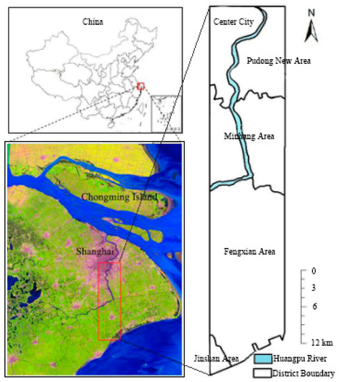 The study area is an urban to rural transect—56 km × 11 km—located in Shanghai, China (latitude 30.80°N–31.23°N, longitude 121.43°E–121.54°E). It starts at Shanghai’s urban core, known as People’s Square, and extends southward in to the urban periphery ending at the north shore of Hangzhou Bay, encompassing a total area of 616 km2. We refer to this as an urban to peri-urban transect hereafter. The transect passes through five administrative districts: the city center of Shanghai, Pudong new area, Minhang, Fengxian, and Jinshan; and accounts for all urban to peri-urban land cover types found in the region (Figure 1). The study area has a typical subtropical monsoon climate and a distinct seasonal temperature pattern with a mean annual temperature of 18 °C and a mean annual rainfall of approximately 1158 mm [32].