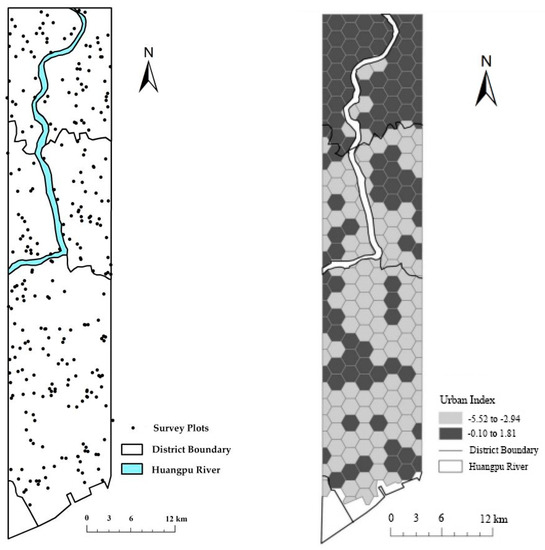 Distribution and locations of field sample plots (left) and related urbanization index hexagons (right) in the Shanghai, China urban to peri-urban transect indicating specific urban (values of −0.10 to 1.81) or peri-urban (values of −5.52 to −2.94) hexagons or sites.