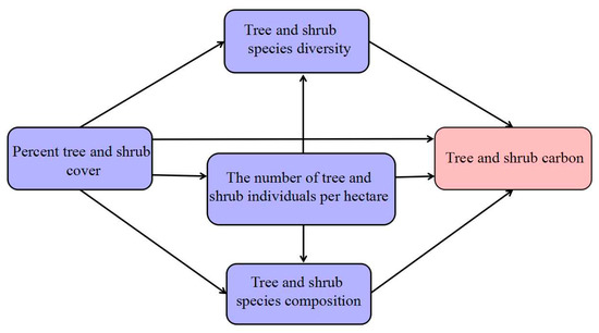 In PA, an initial diagram model is first developed using knowledge of a system to exhibit the causality among variables [29,59]. The hypothetical model (Figure 3) provides a covariance matrix that can then be used to compare expected with observed data, thereby testing the hypothesized model. Accordingly, we used Timilsina et al.’s [58] PA model for carbon storage of North American subtropical urban forest as our test PA. In the model, we validated the effect of generally reported causal drivers of tree and shrub carbon storage (Figure 3).