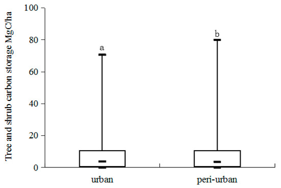 Tree and shrub carbon storage in urban and peri-urban forests. “a” and “b” mean the difference of the tree and shrub carbon storage in urban and peri-urban forests was significant (p < 0.05).