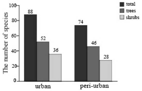 Our plot based sampling found trees and shrubs from 90 species belonging to 74 genera and 50 families in the study transect. Among these were 58 tree species belonging to 50 genera, 34 families; and 59 shrub species belonging to 51 genera, 39 families. We note that since a criterion of DBH > 2.5 cm differentiated a tree from a shrub, a given species could have both a tree and shrub form. The number of trees species in urban and peri-urban forests were 52 and 46, while the numbers of shrub species in urban and peri-urban forests were 36 and 28, respectively (Figure 5).