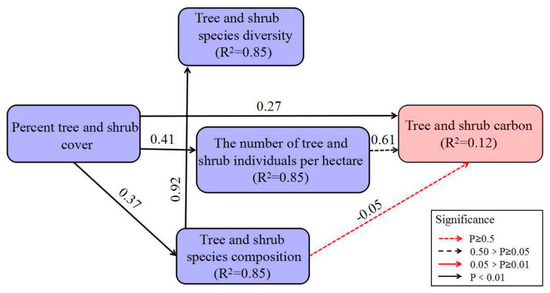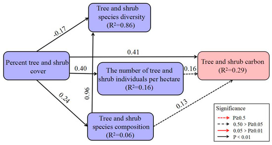The paths for Model 1 (Figure 6) for urban forests revealed that percent tree and shrub cover had a positive and significant (p < 0.05) effect on tree and shrub species composition, the number of tree and shrub individuals per hectare, and tree and shrub carbon (Table 5). Tree and shrub cover explained 85% of the variation in tree and shrub species diversity, but only 14% of the variation in tree and shrub species composition and 17% of the variation is tree-shrub density (Figure 6). Indeed, tree and shrub species composition and the number of tree and shrub individuals per hectare also affected tree and shrub carbon positively. Meanwhile, percent tree and shrub cover had direct and indirect effects on carbon (Table 6), with the indirect effect through the number of tree and shrub individuals per hectare and tree and shrub species composition being less influential (0.044) than its direct effect (0.267; Table 6).