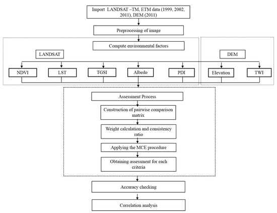 Changes in land surface conditions are closely related to desertification. The main characteristics of desertification are soil degradation, micrometeorological alteration, and the decrease in both land cover and vegetation biomass. In addition to elevation, six other indicators were used to assess desertification, following the procedure presented in Figure 1. The software packages used for this study were ENVI (Exelis Visual Information Solutions, Boulder, CO, USA) for image processing, TerrSet (Clark Labs at Clark University, Worcester, MA, USA) and ArcInfo (Esri, Redlands, CA, USA) for analysing and presenting the results, and SPSS (SPSS Inc., Chicago, IL, USA) for statistical and graphical analysis.