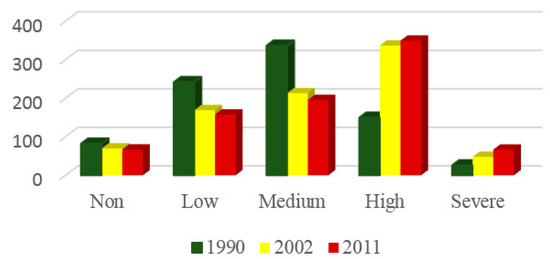 The accuracy of the results for 1990, 2000, and 2011 was confirmed using a confusion matrix (Table 5). The classification was satisfactory, with an average accuracy for all three periods of above 0.8, with a highest accuracy and kappa statistic of 0.84 and 0.80, respectively, for 2011. Due to the relatively low quality of the images for 1990, the overall accuracy and kappa statistic were the lowest of the three years at 0.86 and 0.77, respectively. User and producer accuracies were higher for stable classes compared to disturbance classes. Producer accuracy for the no-disturbance classification was high for all three years, ranging from 86.13 to 92.7%. In terms of the user accuracy for severe desertification, 1990 was the highest of the three years at 98.93%. The overall accuracy of the desertification classification using the decision tree classifier was more than 81%, and the overall kappa statistics were as high as 0.82 in 2002.