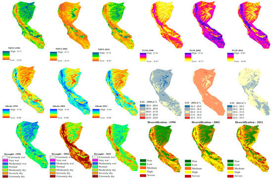 LST ranged from 30 to 32 °C, with the highest value in the regions downstream of severe desertification. LST is higher in the desert region due to its lower soil moisture and higher solar radiative energy [58]. We found different results in 2002 from other years; the change in maximum LST coincided with maximum PDI and albedo. This is consistent with the occurrence of drought in this year (Table 3 and Figure 2). The results of correlation can be seen in Table 4; there is a correlation between NDVI and LST that suggests a negative value (R = −0.02 to −0.22) and the correlation between albedo and PDI demonstrate a positive value (R = 0.80 to 0.98), all occurring at the desertification level in 2002. However, in the other year, the correlation between NDVI and LST showed a positive value (R = 0.08 to 0.29) at the non-desertification level but indicated a negative value (R = 0.12 to 0.97) at the other desertification level. Nevertheless, the correlation between albedo and PDI showed a negative value at the non-desertification level but, on the other desertification level, was associated with a positive value. Non-desertification levels occurred in the forest cover in our study area; we can say moisture is not generally important in forest cover, but in a drought year moisture is an important factor in forest cover. Generally, with high LST availability, PDI increases, becoming similar to both bare soil and vegetation. The dry edge represents the limiting conditions of wet for vegetation cover. Drought reflects very stressed surfaces with low vegetation, LST, and Albedo. 2002 showed the highest LST for overall area, as well as the lowest NDVI and retention of drought. We confirmed that NDVI, LST, and PDI are temporary factors and that TGSI and the desertification process are created in the long term. With increasing NDVI, the albedo becomes lower, masked by vegetation, with decreases in temperature. In areas where the degree of desertification was low, the NDVI values were high, whereas the TGSI and albedo values were low to moderate, indicating that the area was normally wet. However, in areas of high desertification, NDVI values were low and the TGSI and albedo values were high, indicating that the area was severely dry. In the past 20 years, NDVI has decreased in the southern part, where TGSI and albedo were increased.
