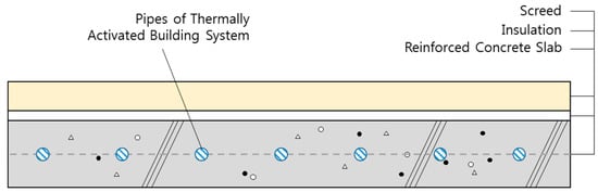 Among the many types of radiant heating and cooling systems, the thermally activated building system (TABS) has gained popularity. This system uses the concrete structure as a heating and cooling system by embedding pipes as demonstrated in Figure 1, which is proposed by ISO 11855 from the International Standard Organization (ISO) []. TABS consists of screed, insulation and reinforced concrete slab and insulation enables the system to handle the load occurred below the system. The embedding pipes in the concrete structure can reduce the installation, operation and maintenance costs. Moreover, the lack of additional installation allows reduction in the building height, which saves a significant amount of building materials []. Since the TABS exhibits characteristics of asynchrony of the plant operation and thermal load, the system can store heat in the concrete structure and shift the loads to a different time, which enables reduction of the peak load [,,,]. Consequently, the plant size can be reduced and made to operate with higher efficiency. However, the asynchrony of TABS operation and actual thermal output to the zone may raise difficulties related to the handling of dynamic and sudden loads. This is because changing the operation according to sudden zone changes takes time. Thermal inertia may continuously deliver heat into the zone, which will cause overheating or overcooling. For cooling, condensation should be considered and control may be a challenging issue [,]. Moreover, changes in different spaces may also cause difficulties in controlling the TABS. Appropriate heat should be supplied into a zone without causing overheating, overcooling or condensation.