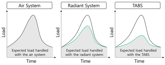 As the amount of load increases, the difference between the room temperature and system temperature will increase and more heat exchange will occur. The phenomenon of self-regulation for cooling is equivalent to that for heating. The main advantage of self-regulation is that the TABS can provide heating and cooling without considering the load that will occur. However, utilizing only self-regulation can provide limited amount of heat to the room, which will cause discomfort when a large load occurs []. Therefore, self-regulation is used with the TABS to handle the minimum expected heating and cooling loads in different zones. The remaining load is handled using an air system to ensure thermal comfort in the zone. The concept of design load handled with air system, radiant system and TABS is illustrated in Figure 2.