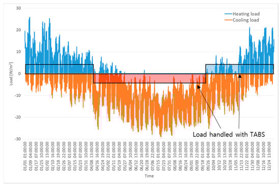 Self-regulation with the TABS can be implemented by maintaining the supply water temperature to be equivalent to the room setpoint temperature. When heating or cooling loads occur, the room temperature may decrease or increase, creating a temperature difference between the surface of the TABS and room and triggering a radiant and convective heat exchange. Figure 3 demonstrates the heating and cooling load of the building and handling of the expected load by TABS with self-regulation.
