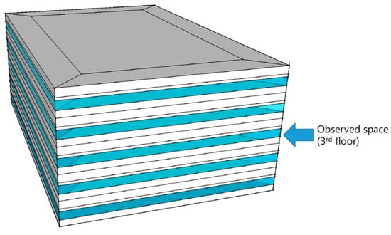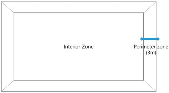 In order to simulate a typical office building, the reference building proposed by the US Department of Energy was used to formulate the boundary conditions. Typical internal heat gain schedule and density from the document that National Renewable Energy Laboratory (NREL) of the US Department of Energy provided [,] were used. These are described in Table 1, and the building envelope is illustrated in Figure 5. Constant supply water temperature of TABS was 22 °C and used flow rate of 3600 kg/h. The air system used supply air temperature of 12 °C and 35 °C for cooling and heating, respectively.