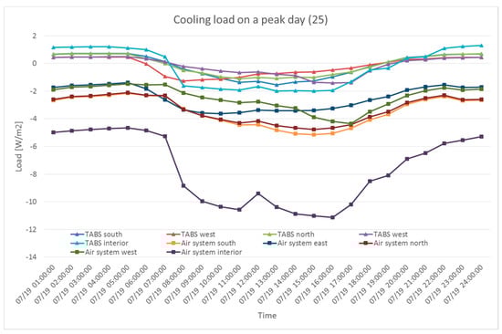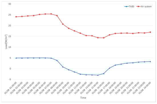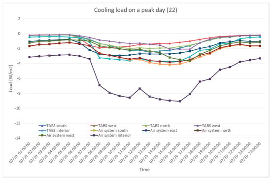 Cooling load handled using the TABS (22 °C) and air system on a peak day.