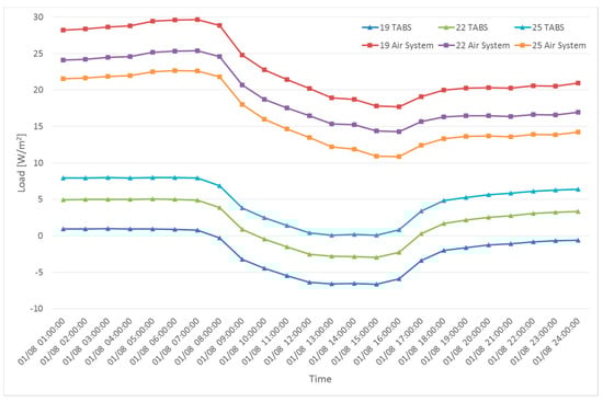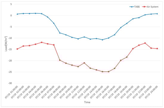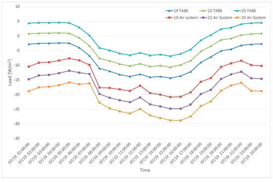 In Figure 6 and Figure 7, TABS load values are the heat exchange between TABS surface and the room and air system load values are the amount of heat transfer needed with air system to keep 22 °C of room temperature. In Figure 6, the TABS could remove a relatively large amount of heating load in the morning and night of a peak heating day. However, in the afternoon, the TABS absorbed coolness more than heat and became negative, which implies that the entire thermal mass of the TABS was not used and the self-regulation of the system was only partially executed. In Figure 7, a relatively significant amount of load was removed in the afternoon of a peak cooling day. However, in the morning and night, the TABS absorbed more heat than the coolness it provided. Since negative values appeared on peak heating and cooling days, only partial self-regulation was performed. Thus, higher and lower supply water temperatures need to be applied for heating and cooling, respectively, to increase the utilization of the TABS. The simulations were performed and results are demonstrated in Figure 8 and Figure 9 for removing the heating load and cooling load, accordingly. Since the design temperature difference between the supply and return temperature was 3 °C, supply water temperatures of 19 °C and 25 °C were used [].