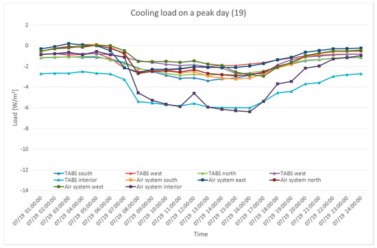 Cooling load in different zones on a peak day (supply 19 °C).