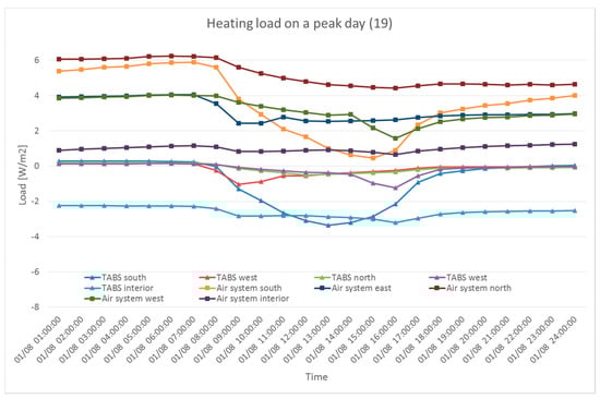 Heating load in different zones on a peak day (supply 19 °C).