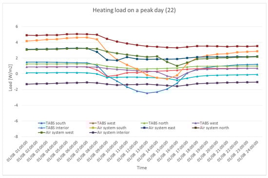 Heating load in different zones on a peak day (supply 22 °C).