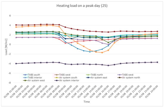 Heating load in different zones on a peak day (supply 25 °C).