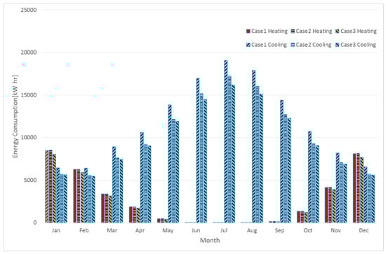 Moreover, the total energy consumption decreased as the use of the energy-efficient TABS increased. In Figure 19, monthly energy consumption for heating and cooling was demonstrated. Compared to the conventional control strategy with case 1, TABS in the interior zone decreased the energy consumption for the entire year in cooling. Since the area of TABS is smaller in parameter zones, case 3 reduced the energy consumption less than case 2. However, the energy consumption in case 3 was decreased for both heating and cooling due to the seasonal changes of the supply water temperature.