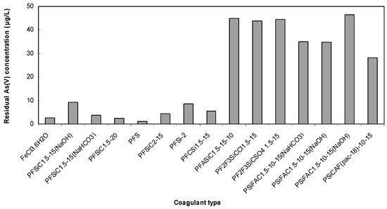 However, composite coagulants based on aluminum (i.e., PFASiC 1.5–15, PSiFAC 1.5–10, etc.) were not efficient enough for the removal of As(V), in comparison with the composite coagulants based on iron, despite the fact that poly-aluminum chloride has been shown in the literature to be very efficient towards As(V) removal [13]. Therefore, this study was further focused on the use of pre-polymerized coagulants of iron and the specific investigation on As(III) removal.