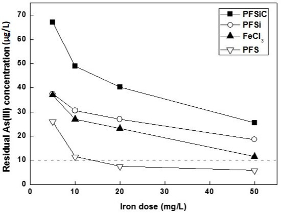 Further investigations were conducted using PFS, PFSi, and PFSiC for the examination of As(III) removal. These results were compared with the corresponding results obtained by the use of ferric chloride (commercially available coagulant), and the results are shown in Figure 2.