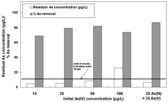 Several studies have examined the direct removal of As(III), i.e., without the application of the pre-oxidation step, with a commercially available coagulant addition, such as ferric chloride, ferric sulfate, or aluminum sulfate. However, these studies have shown that the reduction of As(III) to concentrations below 10 μg/L is not feasible for pH values relevant to drinking water treatment and for realistically applied coagulant concentrations [11].
