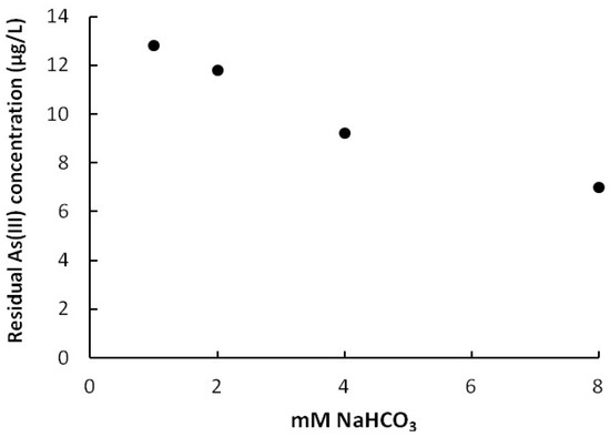 The previous section showed that the use of PFS can reduce As(III) from 50 μg/L to below 10 μg/L by applying a coagulant dose of 5 mg/L. These results are considered as efficient; however, they were obtained from waters containing an alkalinity of 4 mM (NaHCO3) at pH 7. According to another study, where arsenic concentration in groundwaters of Northern Greece was investigated, this value is realistic and actually is at the lower end of values measured in the arsenic affected ground waters in this region [5]. Values of alkalinity ranged between 4 and 8 mM HCO3 in this area, and similar or slightly higher concentrations were measured in other areas with arsenic polluted groundwaters, such as in Argentina [24], in the Pannonian basin [25], and in Pakistan [26]. Therefore, since alkalinity is known to affect the efficiency of coagulation, in the present study, alkalinity values from 1 to 8 mM were examined to evaluate the effect on As(III) removal. The results are shown in Figure 4.