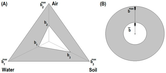For the case of three environmental components n = 3, Rojanschi’s method operates with equilateral triangle to describe the ideal surface and a smaller enclosed triangle to depict the real surface (see Figure 1A). According to Equation (2), the index of global pollution for the case of n = 3 (Air, Water and Soil) is given by: