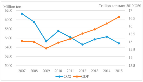 At the 2015 World Climate Conference held in Paris, 196 parties (including 195 separate countries and the entire European Union) came to an agreement on the steps needed to limit global temperature rises to no more than 2 degrees Centigrade. According to previous studies published by the Intergovernmental Panel on Climate Change (IPCC) [16,17], CO2 emissions have historically always increased in line with improvements in the global economy. However, the United States is currently experiencing negative growth in CO2 emissions, while the country’s GDP per capita has continued to grow since 2007. Based on the BP Statistical Review of World Energy 2016 [10,18,19,20], US carbon emissions increased year-on-year before 2007. Then, between 2007 and 2015, US carbon emissions decreased from 6132.4 to 5485.7 Mt per annum, as shown in Figure 1. Accordingly, the US provides a good example for other countries around the world on how to decrease carbon emissions without holding back economic progress. The purpose of this paper is also to reveal the major factors affecting CO2 emissions and thus give other countries useful information to help them formulate effective energy-saving and carbon emission-reduction policies.