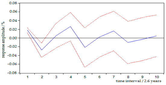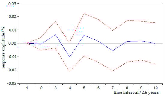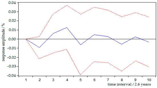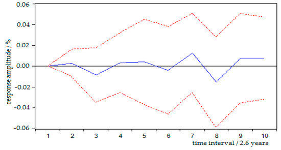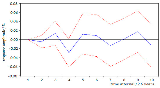 Figure 4 is the response of carbon emissions to the emissions themselves. As we can see from Figure 4, there has been no immediate response to the positive impact of a standard deviation of emissions during the current period. In addition, emission levels are in a state of fluctuation at all times in the abovementioned graph. The emission levels decreased rapidly during the first phase, until the minimum value was reached in the second period, when the levels suffered a negative shock from themselves. Subsequently, CO2 levels maintained an upward trend, right up to the time the maximum level was reached in Period 4, where the levels have a positive influence on themselves. Overall, emission levels have been in a state of fluctuation, but the amplitude of that fluctuation is getting smaller and smaller, thereby indicating that carbon emissions will gradually become stable at some point in the future.